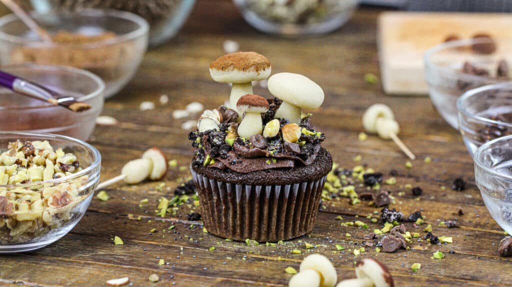 装饰这些蘑菇纸杯蛋糕