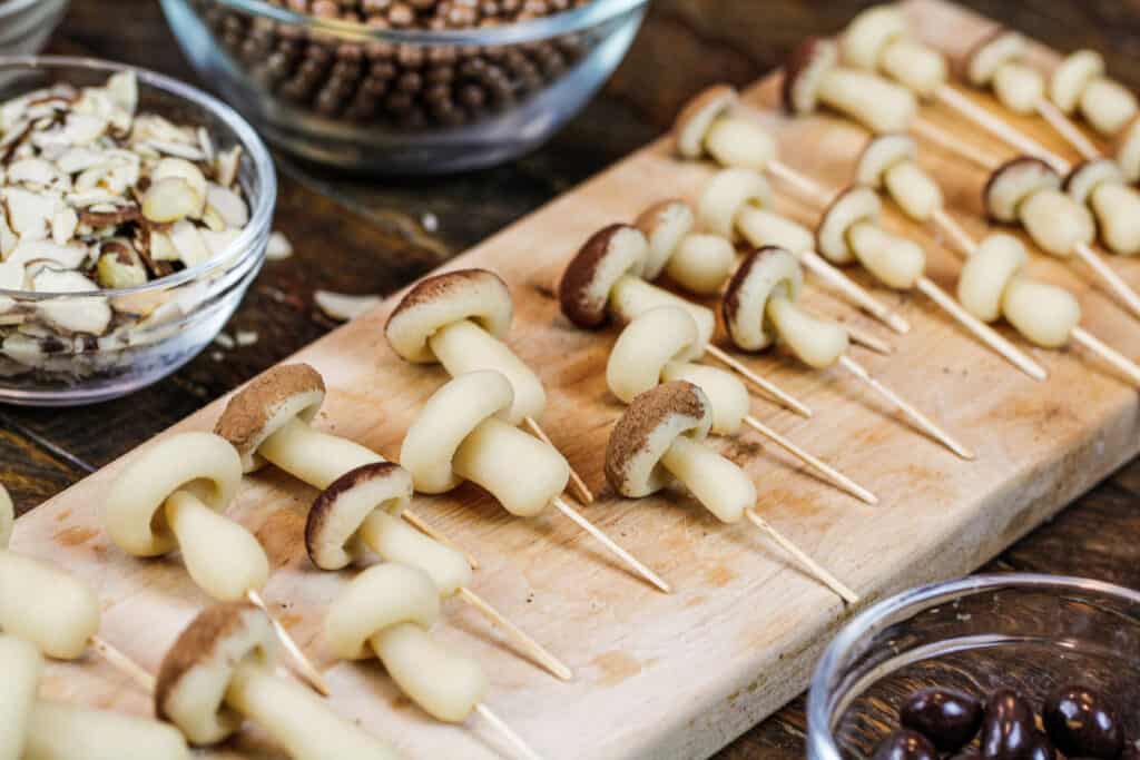 最后的杰作是小蘑菇!为了保持简单,我用杏仁软糖做了形状。这是完美的颜色,很容易处理。