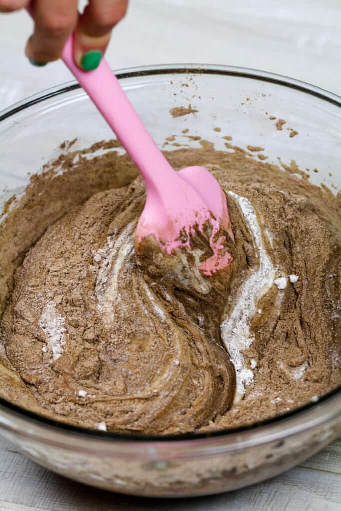 - 用橡胶刮刀将干成分折叠成湿成分。一旦混合击球球应该有点厚。