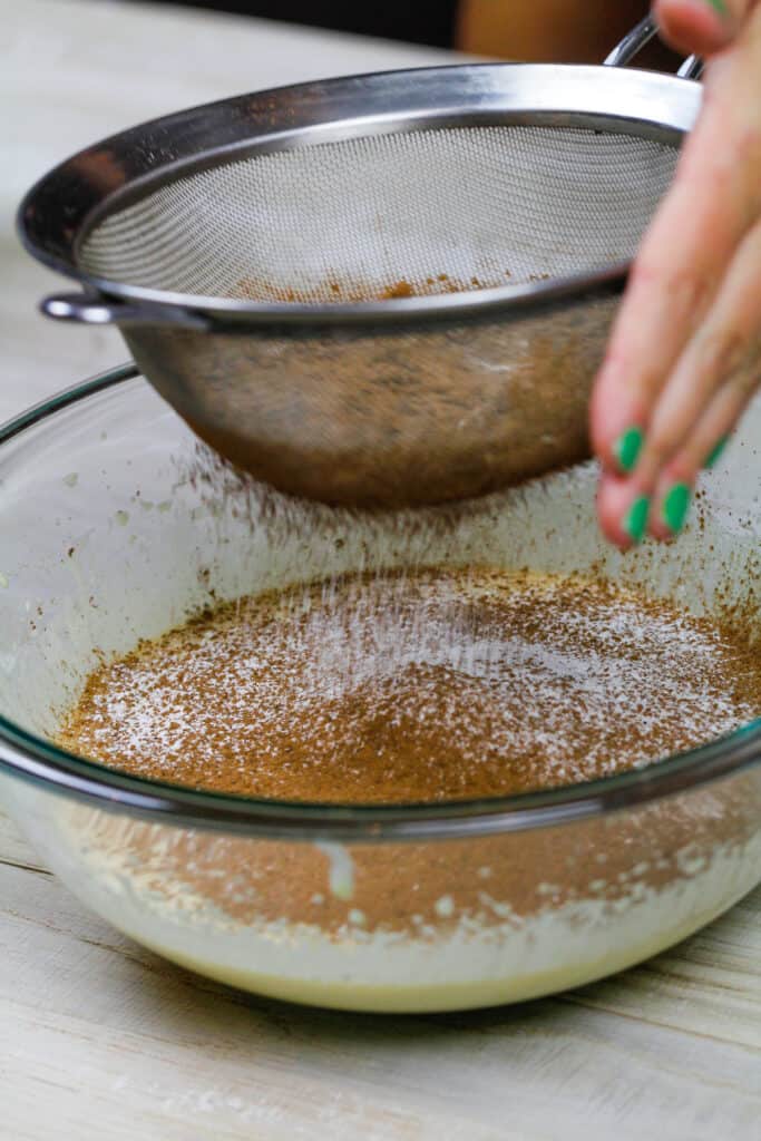 嗨!这个食谱看起来很好 - 我是饼干黄油的巨大粉丝。我想为感恩节制作这个,但我对第5和第6步感到困惑。5表示将干燥的食材筛选成蛋混合物,但6表示使用橡胶刮刀将干燥成分折叠成鸡蛋混合物。你能澄清一下吗?非常感谢!