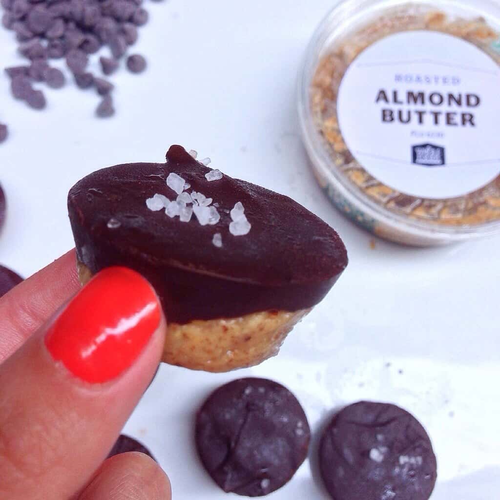 结合前四种成分,混合直至完全混合。将此混合物压入迷你杯托盘的底部,将每个杯子装满1/2。不用担心喷洒罐头,杏仁黄油中的油会在杯子固定后弹出。将托盘放在冰箱中约5分钟,取出,然后将融化的巧克力倒在杏仁混合物的顶部,将每个杯子填充到顶部。将一点点海盐撒在每个杯子的顶部,然后再放回冰箱,再放置20分钟。设置后,用锋利的刀将杯子从纸杯蛋糕托盘中弹出。上菜前,让杯子静置约5分钟,以使巧克力稍微软化。