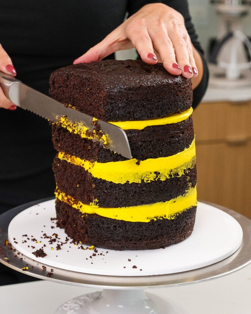 - 一旦结霜,用锋利的刀来修剪1英寸的蛋糕从一边的蛋糕。翻转的蛋糕,并将削减部分对蛋糕的蛋糕。我喜欢用台式刮刀生活委员会的蛋糕和翻转。如果你的蛋糕层开始彼此分开了蛋糕后,插入吸管,筷子,或销通过蛋糕一起帮助直到面包屑的外套。