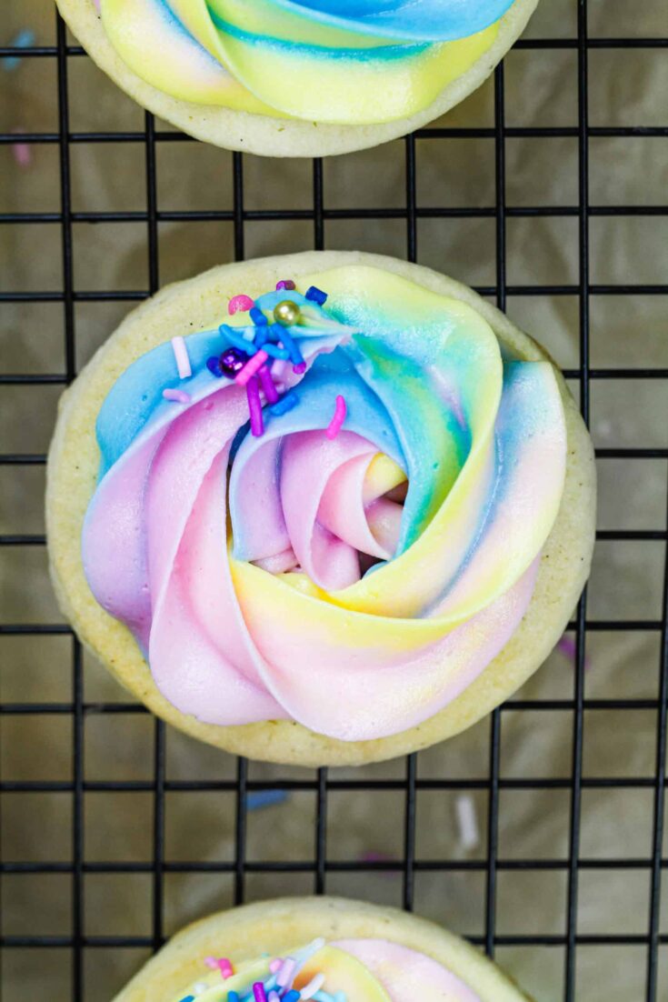 - 将霜冻放入管道袋中,并根据需要装饰!我没有使用管道尖,只需在我的袋子的末端切开一个1英寸的开口,以在我的饼干顶部管制一些简单的漩涡。