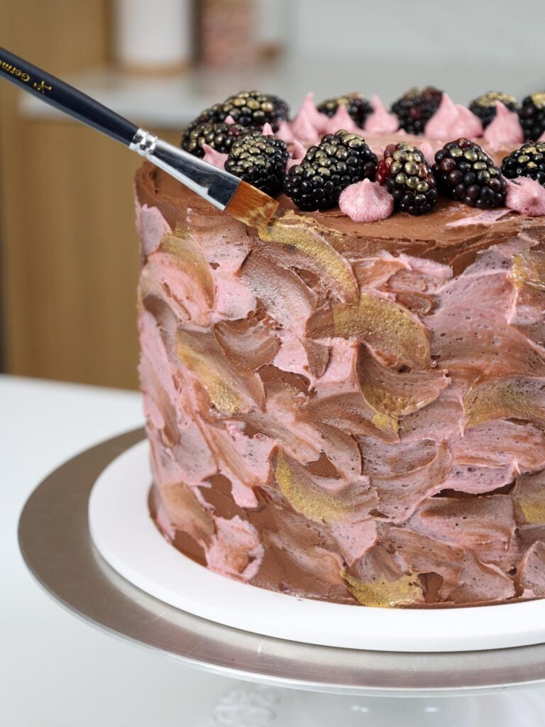 - 冷却蛋糕直到糖霜公司联系,然后使用无菌画笔画浆果和条纹的蛋糕可食用的金漆或黄金光泽尘埃混合酒或提取。这是可选的但是它真的提升了这个蛋糕的样子!