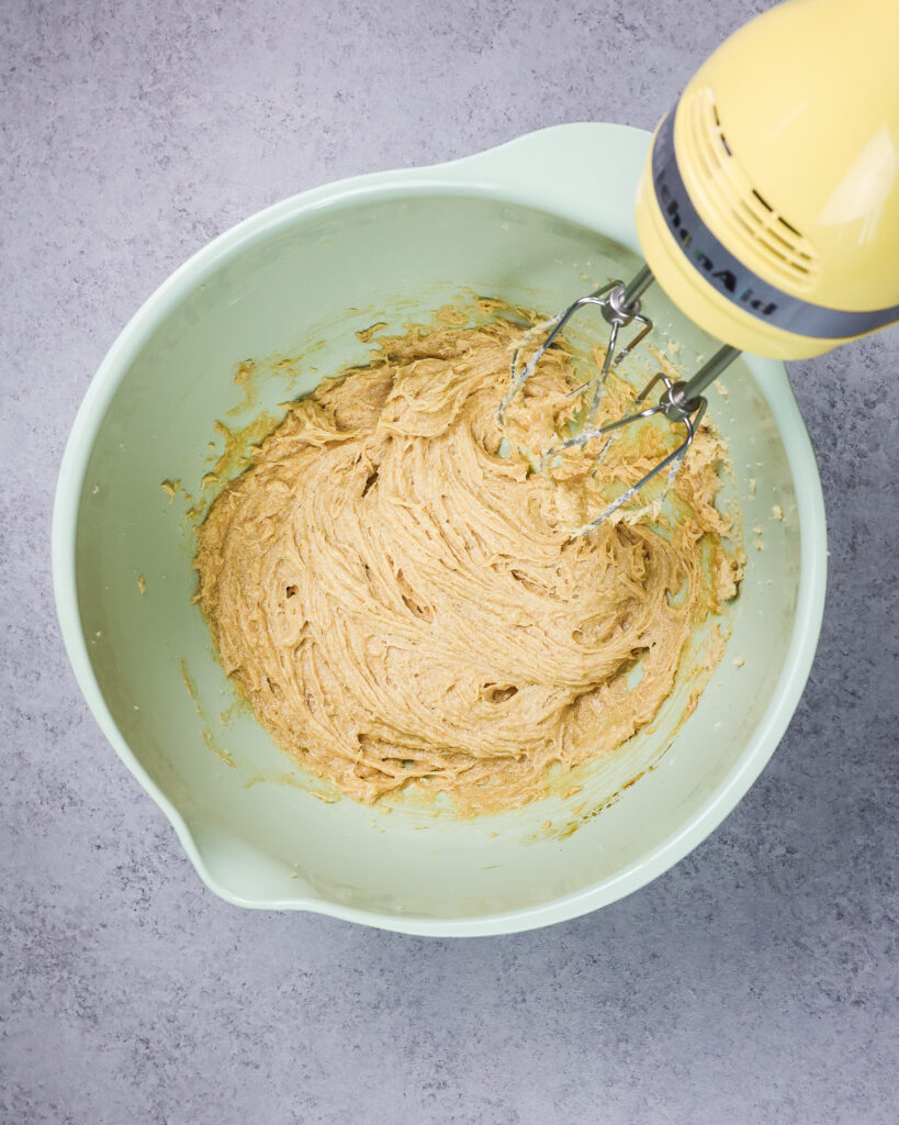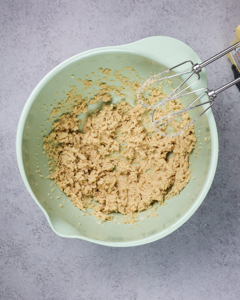 - Cream together the butter, brown sugar and white sugar with a stand or hand mixers until the mixture lightens in color (about 1 minute).