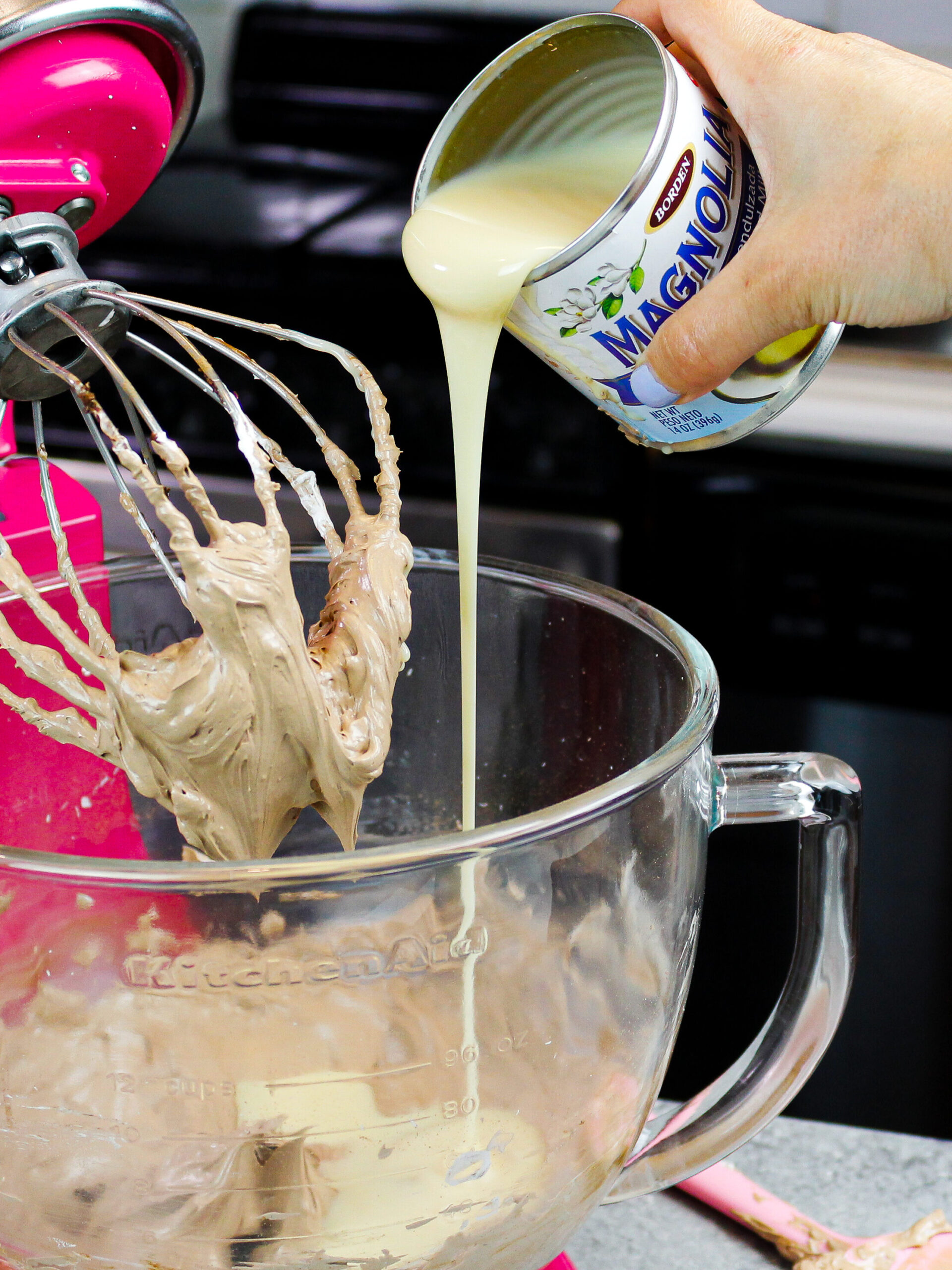 You simply whip the butter up until it’s light and fluffy, carefully mix in the cocoa powder, then slowly incorporate the sweetened condensed milk.