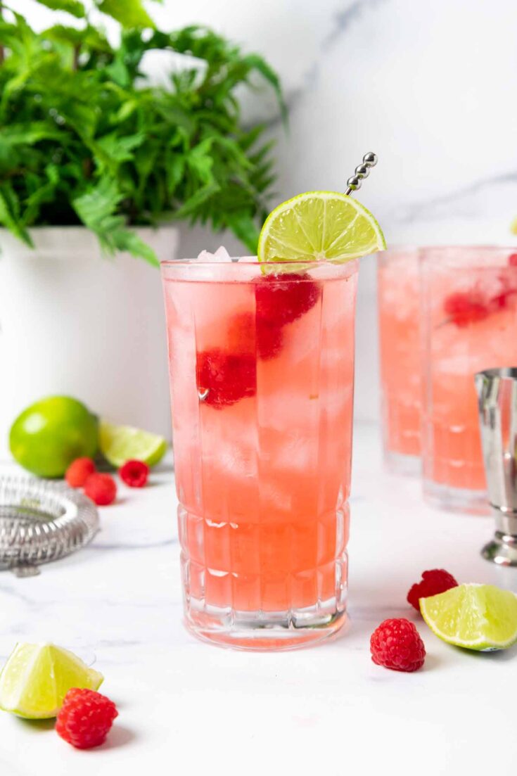 这Floradora鸡尾酒是一种美味的杜松子酒饮料,非常清新、平衡由于飞溅覆盆子简单的糖浆和姜汁啤酒。