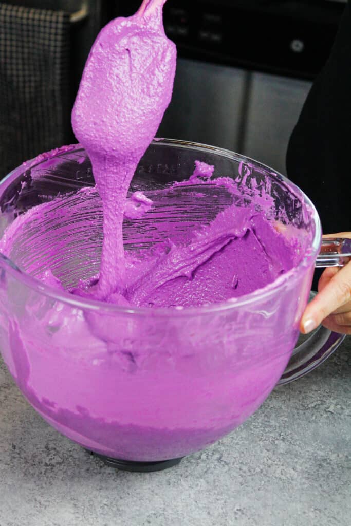 面糊应该形成一条厚厚的缎带,当它被提起时,就像下面的照片那样从抹刀上流下来。