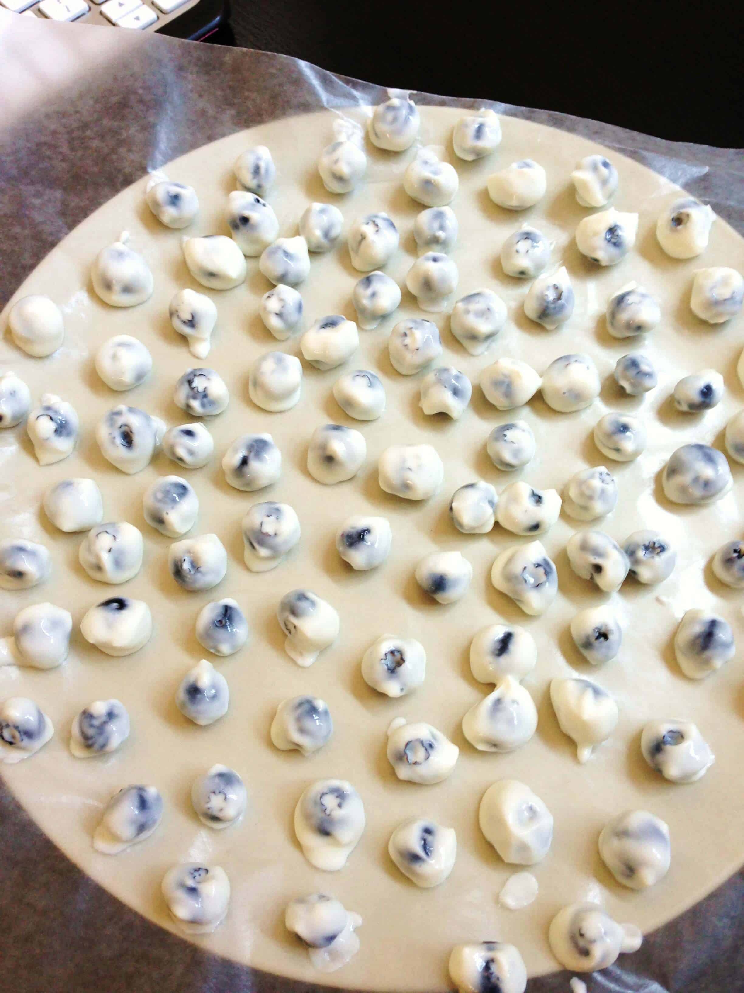 我不推荐用冷冻的蓝莓来做这个,因为一旦蘸了,它的质地就和新鲜的蓝莓不太一样。
