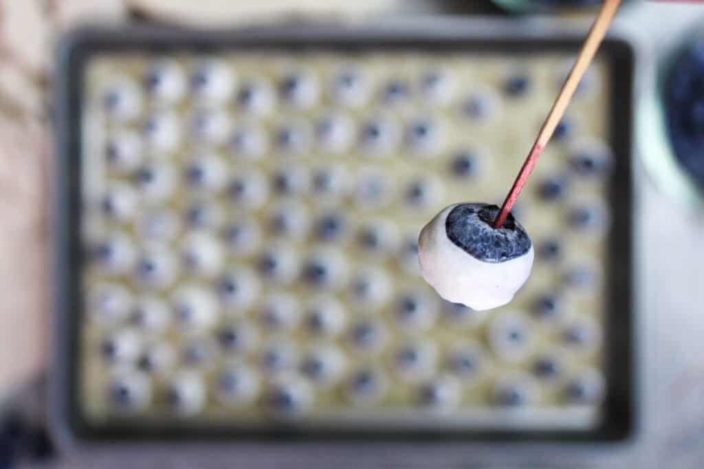 - 用牙签把每一个蓝莓沾到酸奶里,覆盖大部分蓝莓。