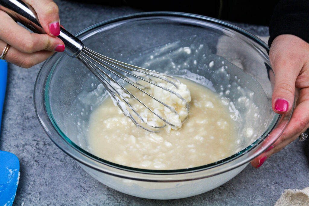 这通常需要我2-3分钟。混合物起初看起来很笨拙,但相信这个过程!它会在颜色亮起,搅拌越多。