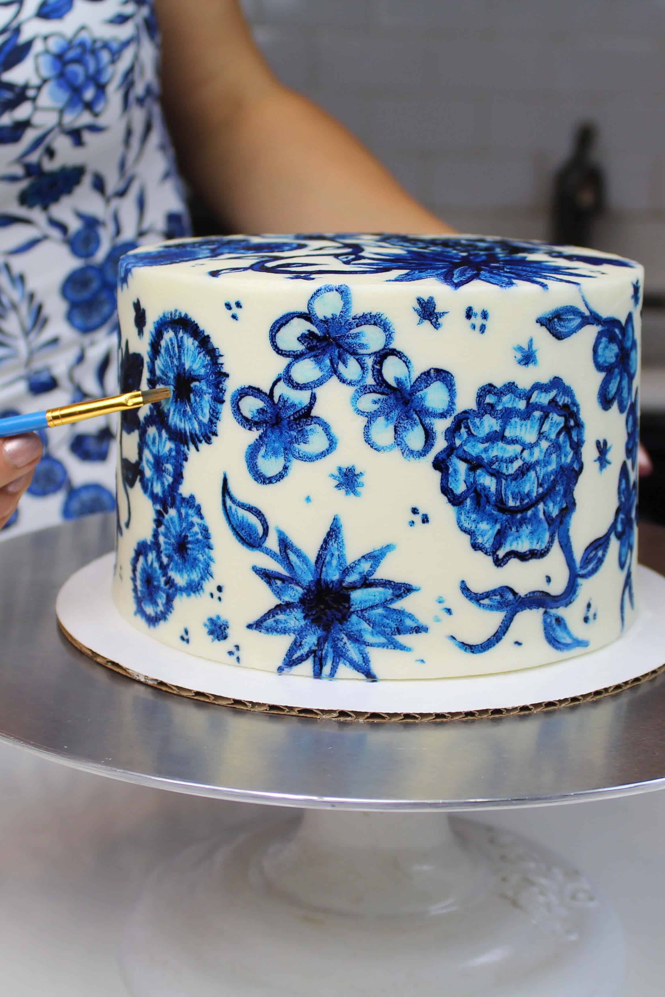 我开始画的蛋糕,并概述了一些花。这看起来是用两种不同深浅的蓝色凝胶食用色素。一个是海军蓝色,另一个是皇家蓝色。