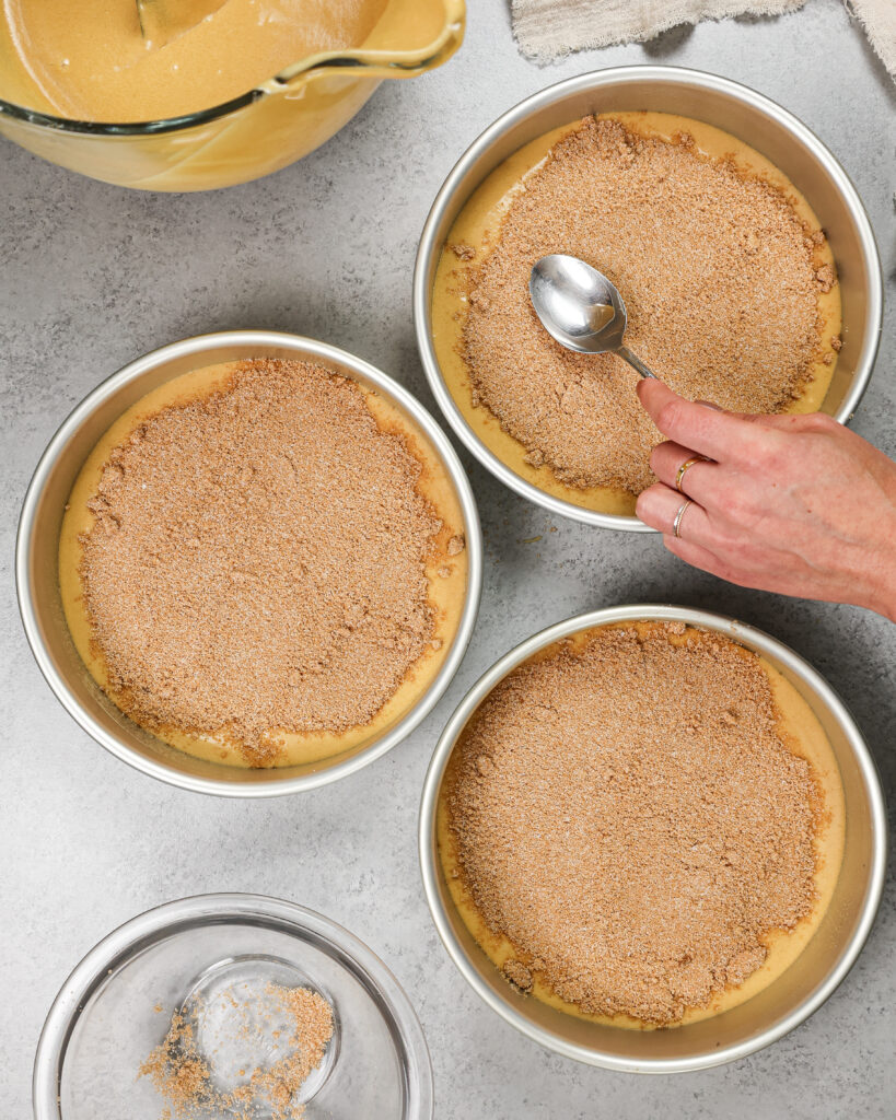 - 把剩下的蛋糕糊三锅之间的均匀。是最容易细雨的蛋糕糊肉桂糖的混合物,然后用一个小抹刀传播。