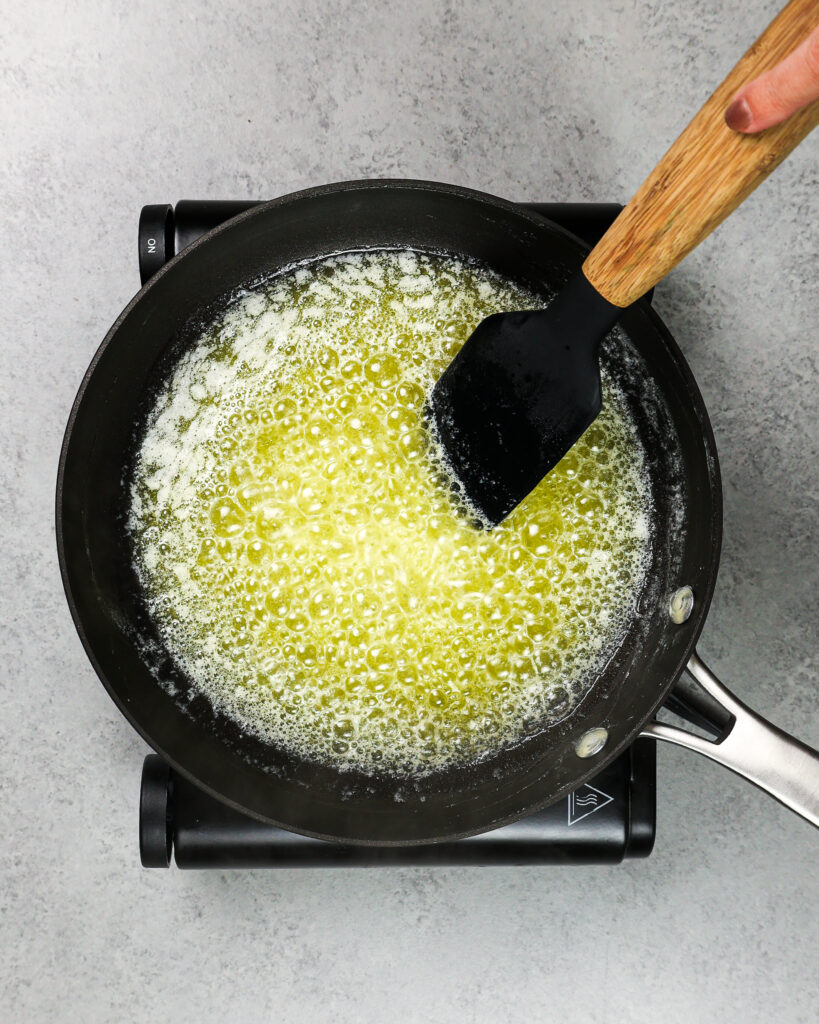 - 一旦黄油完全融化,不断搅拌,以防止锅的底部的黄油固体燃烧。看起来应该开始泡沫,泡沫在上面。让黄油继续煮,直到它变成琥珀色,开始疯狂的味道。