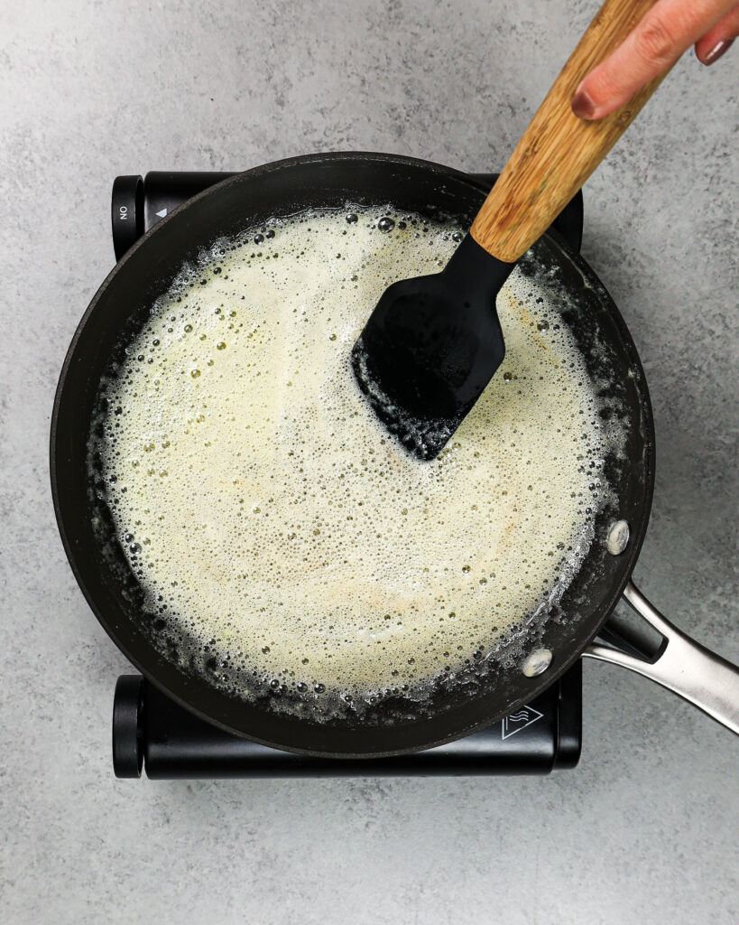 一旦黄油完全融化,不断搅拌,以防止锅的底部的黄油固体燃烧。看起来应该开始泡沫,泡沫在上面。