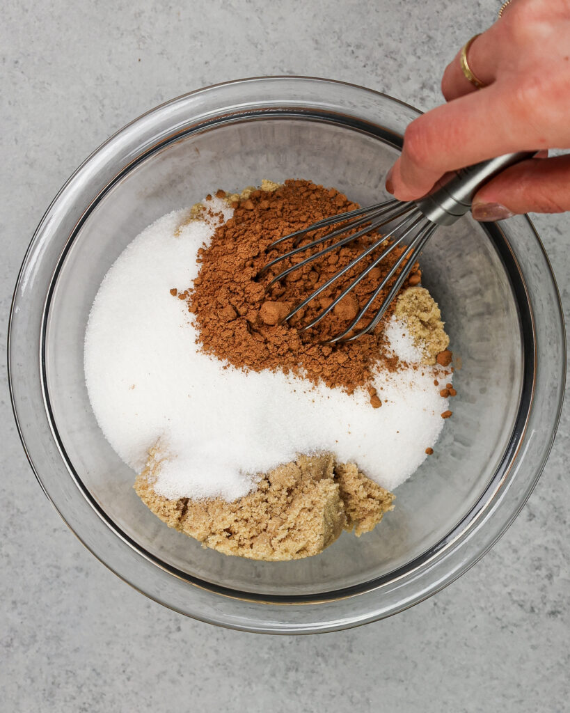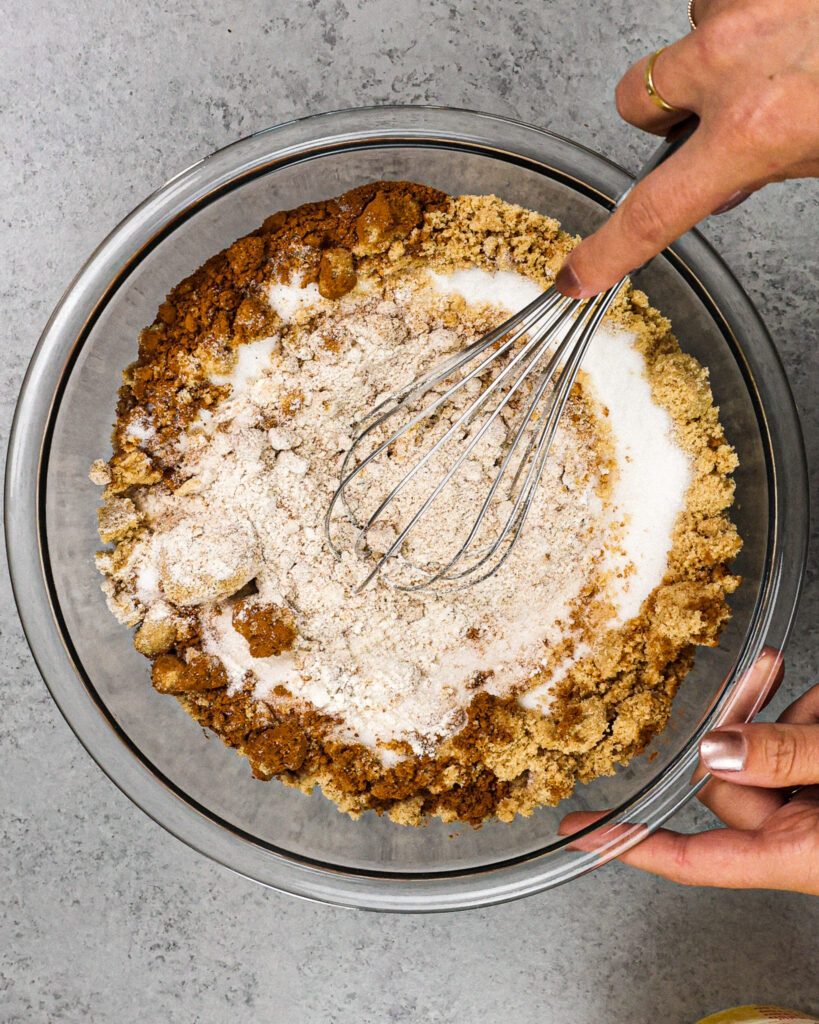 接下来,肉桂表层材料填充。在一个大碗里,加入面粉、红糖,砂糖,地面肉桂香料群岛,和盐。