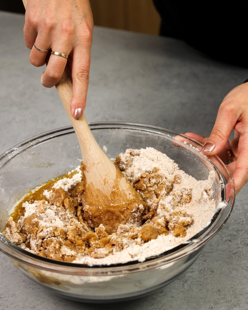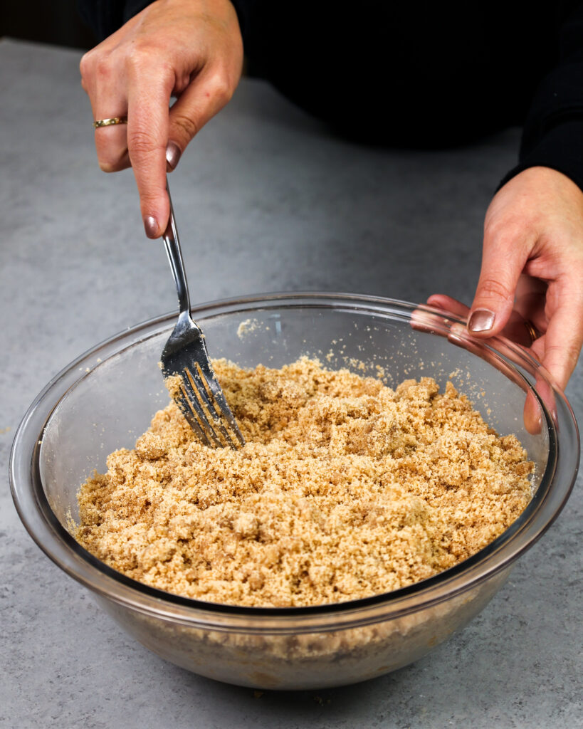- 把融化的黄油倒进干配料和搅拌在一起用叉子或搅拌使一些不错的,大崩溃。你应该得到一碗看起来湿沙子和一些豌豆大小的块。备用。
