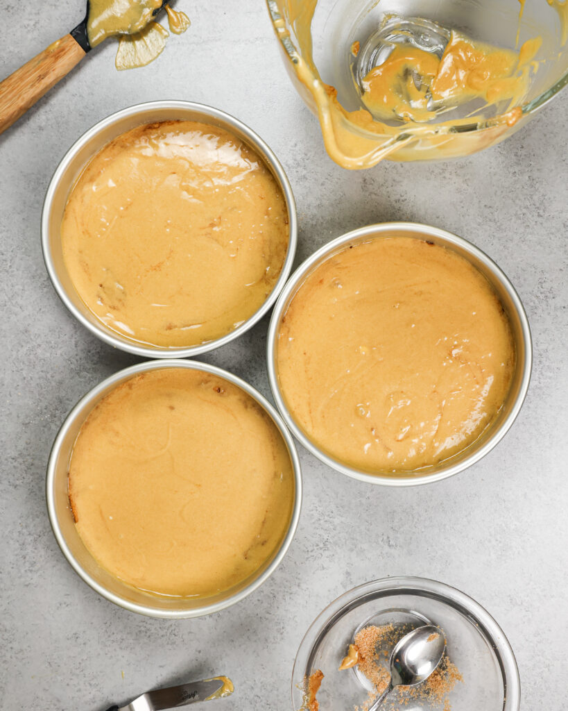 预热烤箱至350°F / 175°C。行三8”锅用羊皮纸轮和油脂贝克的欢乐不粘锅的烘焙喷雾。