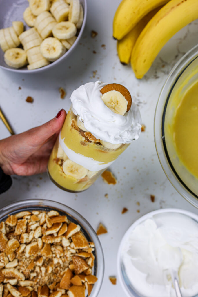 一起是如此之快,是用几层美味新鲜的香蕉,甜美的香草布丁,切碎的香草薄饼和鞭打浇头。