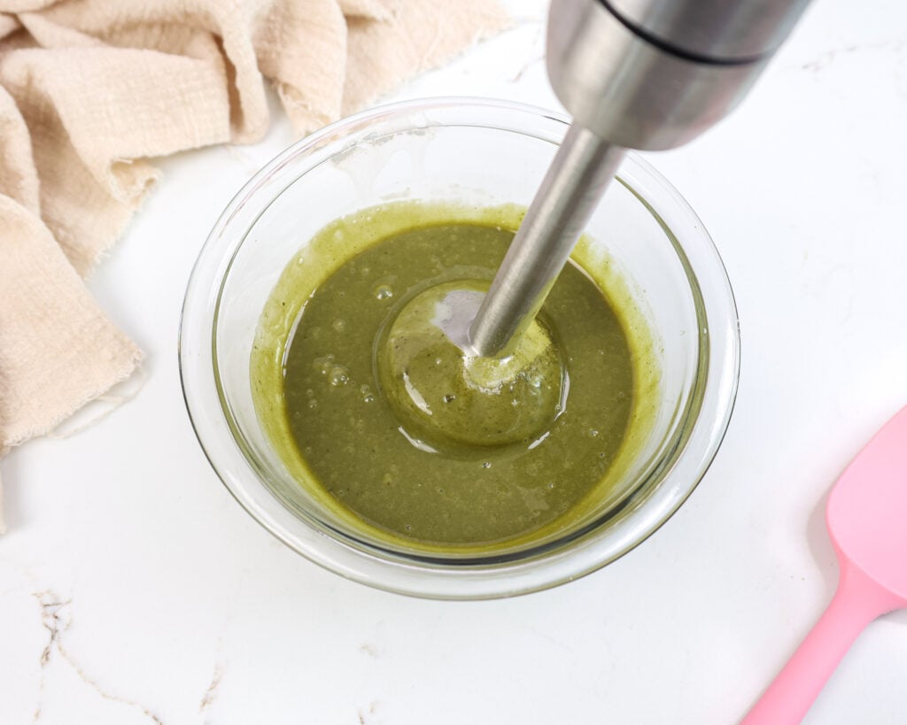 然后用一个混合在一起浸入式搅拌器或勺子。一旦混合在一起,光滑,用9 g或1汤匙混合抹茶粉,搅拌至总和。