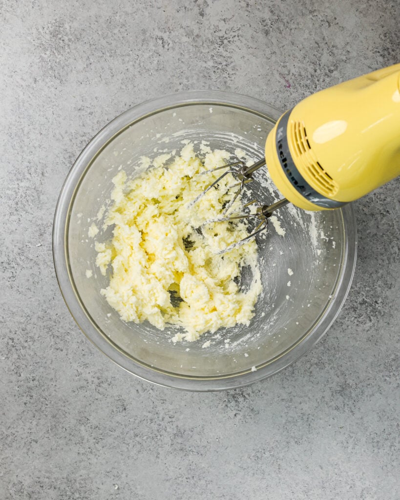 - 奶油黄油和砂糖一起站或手搅拌机,直到混合物减轻的颜色(约1分钟)。
