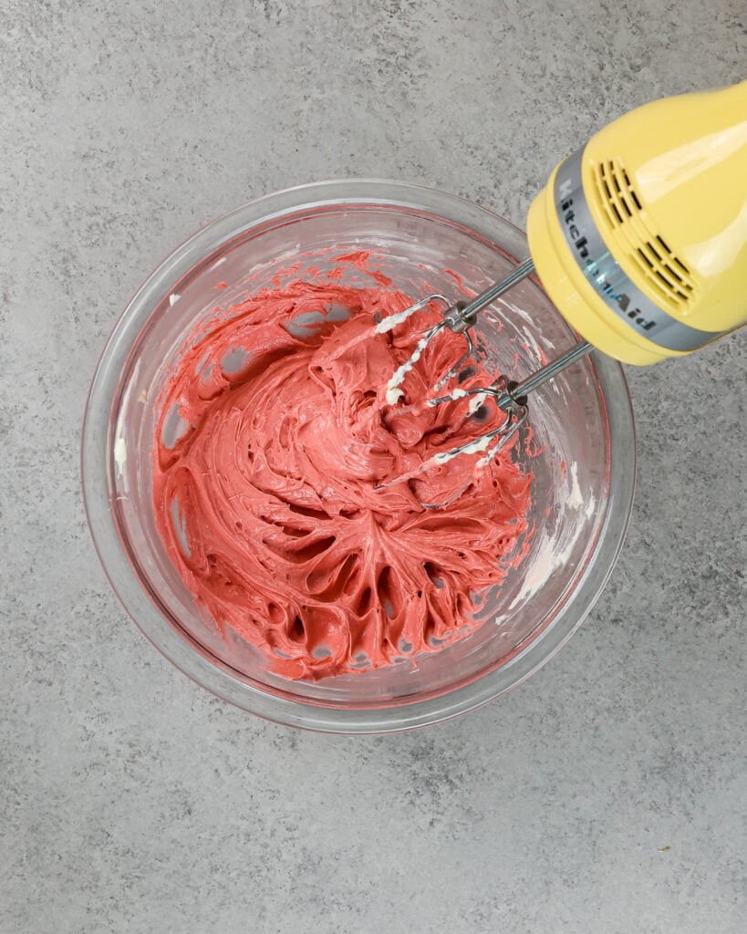 - 而饼干面团发冷,使芝士蛋糕填!用电动搅拌机一起打奶油奶酪,砂糖,冷冻树莓粉,柠檬汁和香草精。混合介质上高速到组合和光滑。如果你想让你填充满活力的颜色,混合凝胶喷红色食用色素。