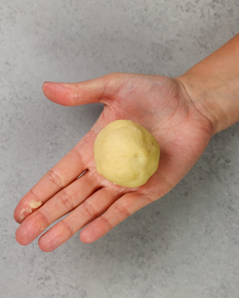 - 非常轻的湿手和水。平饼干面团球在你的手掌和芝士蛋糕中心填写。如果你有温暖的手,把两个表之间的饼干面团的羊皮纸。