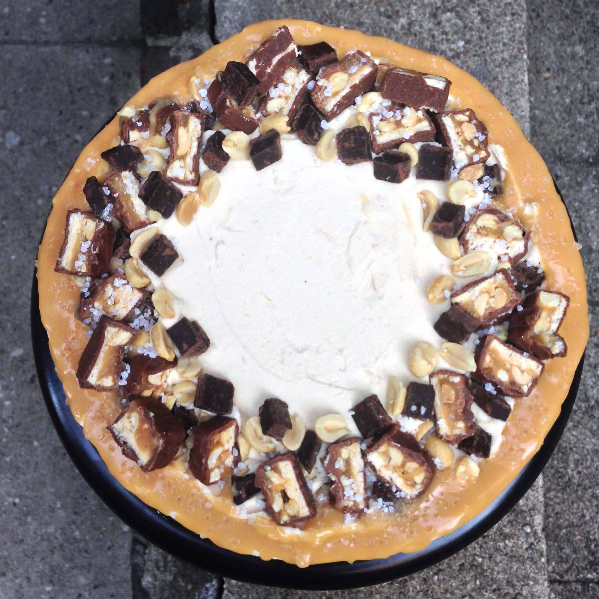 霜蛋糕的每一层厚厚地涂厚厚的咸焦糖奶油乳酪,细雨咸焦糖,咸花生和巧克力块。堆栈层,应用薄瓤外套。冷藏30分钟的蛋糕,然后应用另一层奶油乳酪。细雨热焦糖蛋糕上的边缘,并使周围的顶部边缘士力架碎的花生,巧克力块,和海盐。