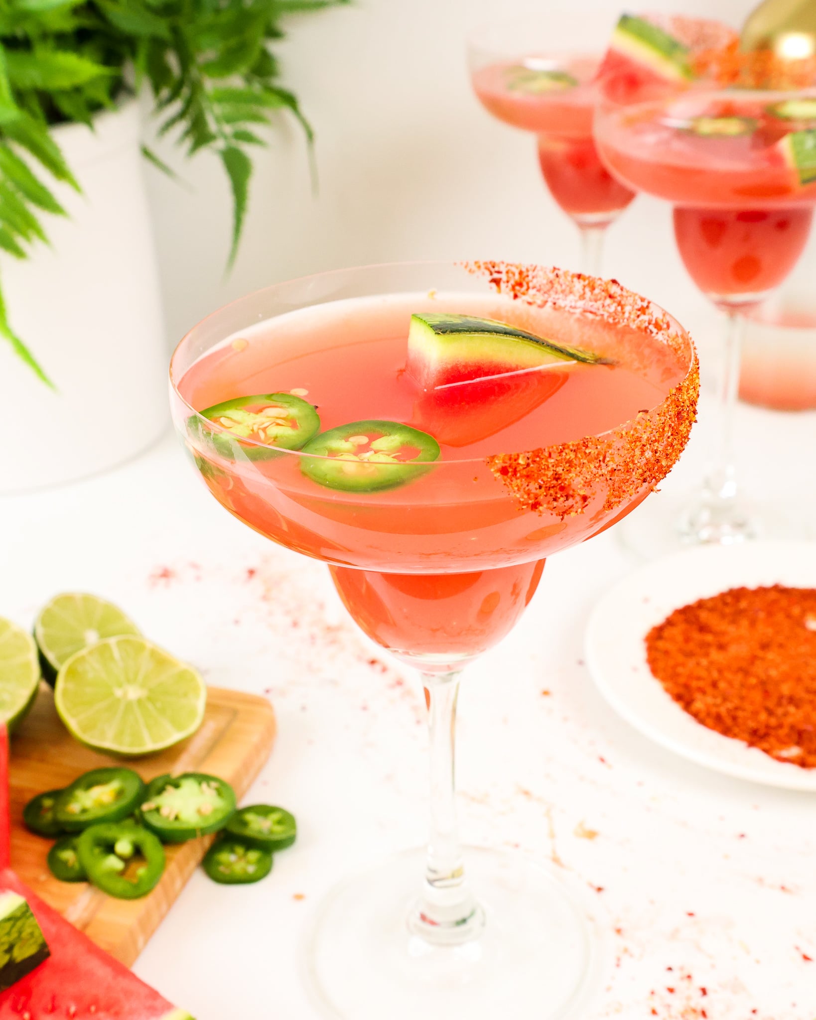 我用一个经典的玛格丽塔酒杯西瓜墨西哥胡椒玛格丽塔鸡尾酒配方。